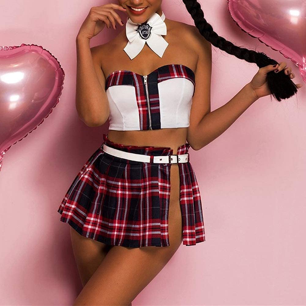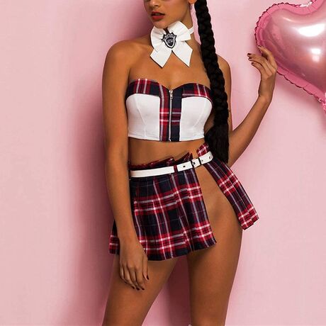 Σέξυ στολή κολλεγιοκόριτσου σε άσπρο και καρό συνδυασμό, που αποτελείται από μπουστάκι με μπροστινό φερμουάρ και φουστάκι με ζώνη. Ακόμα, περιλαμβάνει τσόκερ με γιόγκο, για τις πιο hot και τολμηρές εμφανίσεις!